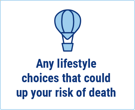 - What risky lifestyle choices are you into? If you skydive, rock climb without a harness, and so on, they need to know. And be honest.